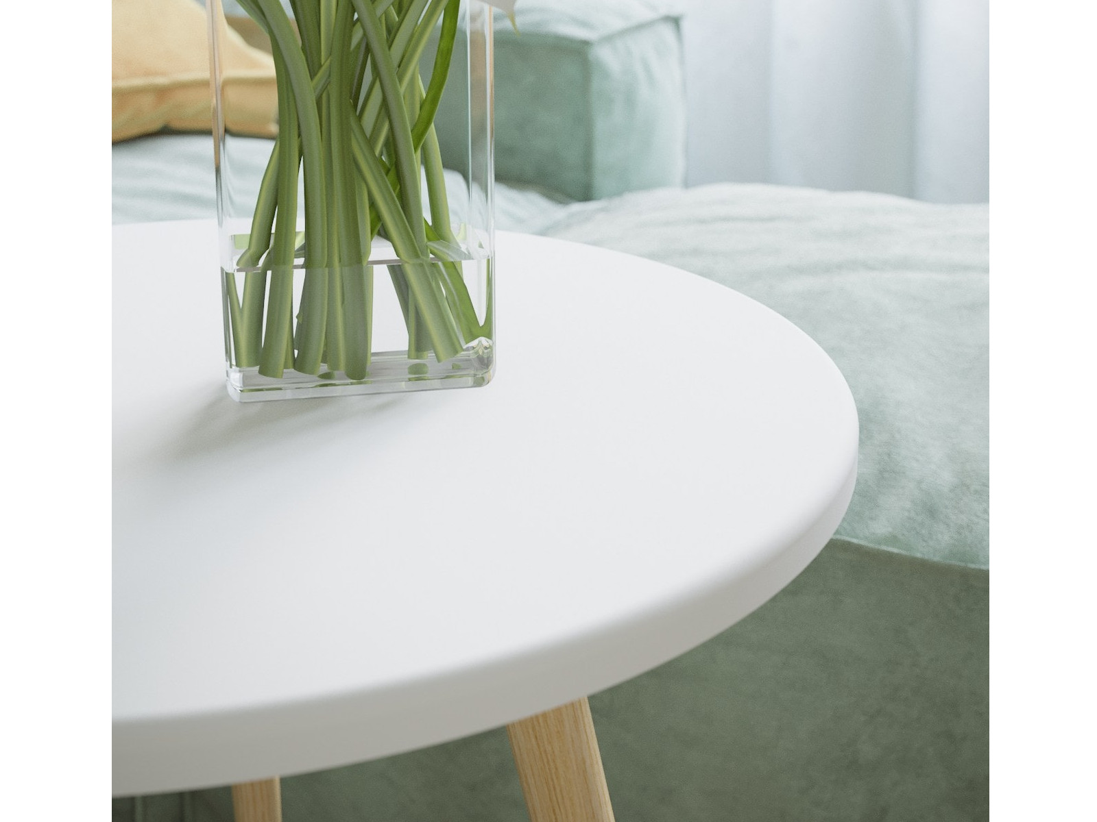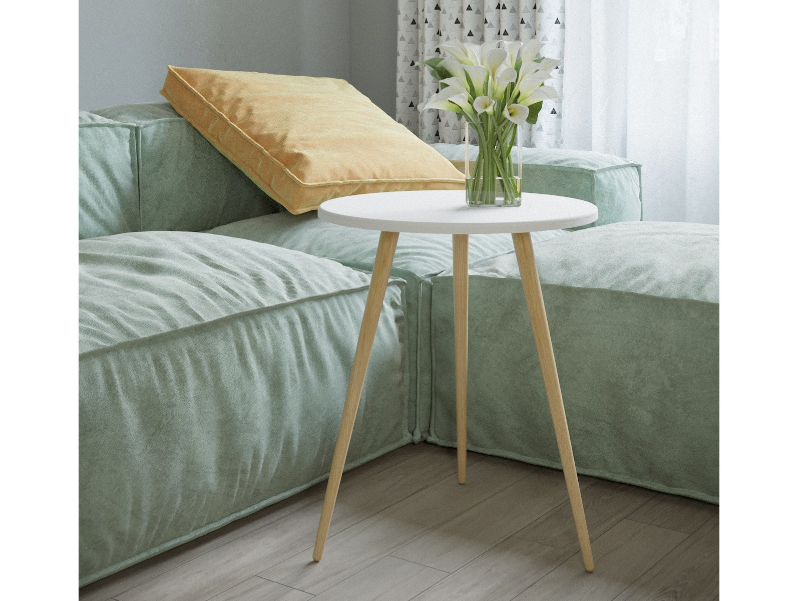 В дизайне использована простая геометрия столешницы в сочетании с деревянными опорами.