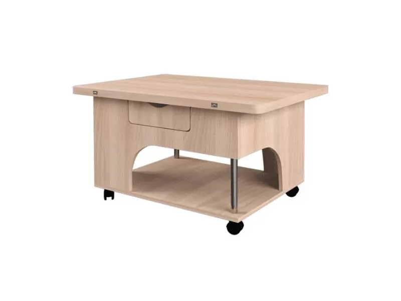 При раскладывании столешница поднимается вверх на упругих шарнирах, а из-под нее достается еще один небольшой столик на шарнирах чуть короче. Этот столик и будет служить опорой второй половине столешницы. Таким образом, получается высокий стол для обеда.