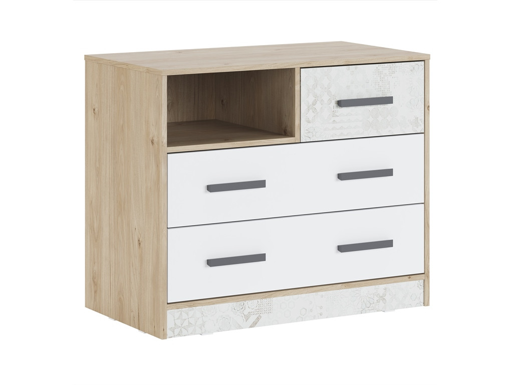 - Комод имеет три выдвижных ящика на шариковых направляющих полного выдвижения и открытую нишу.
