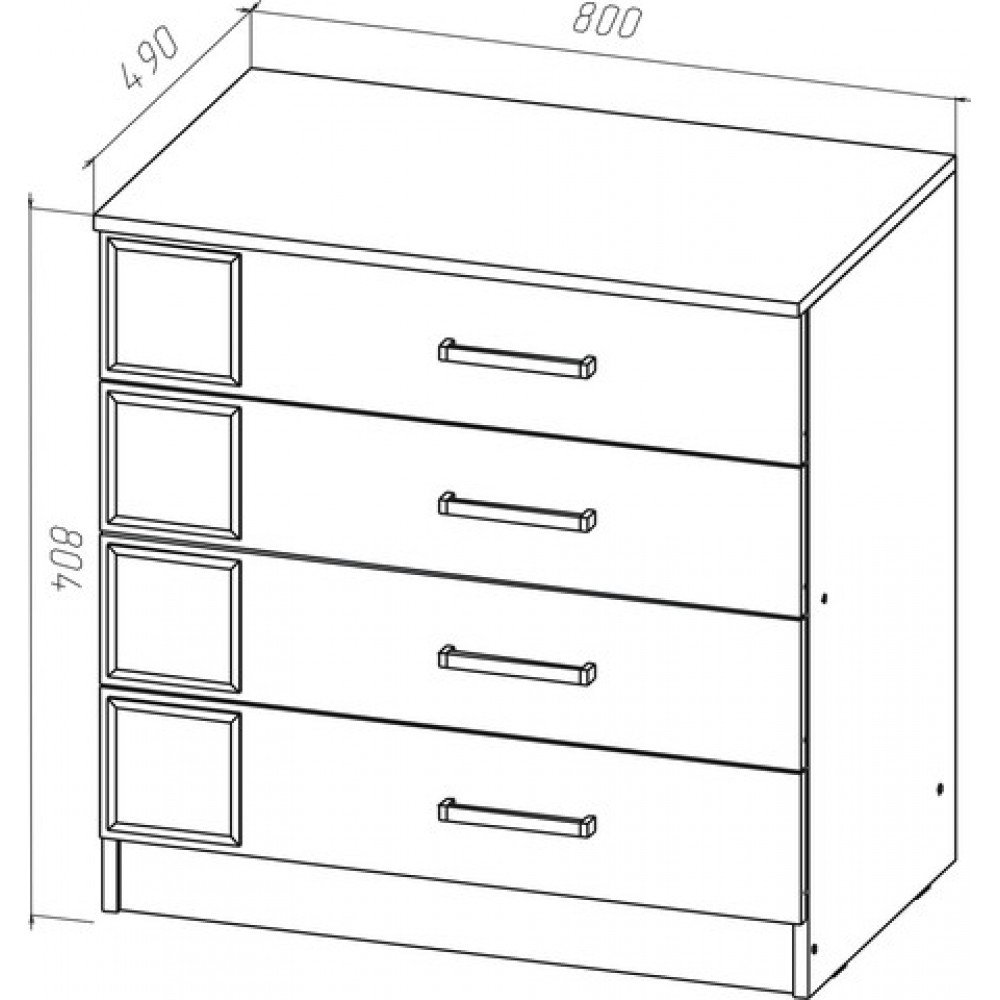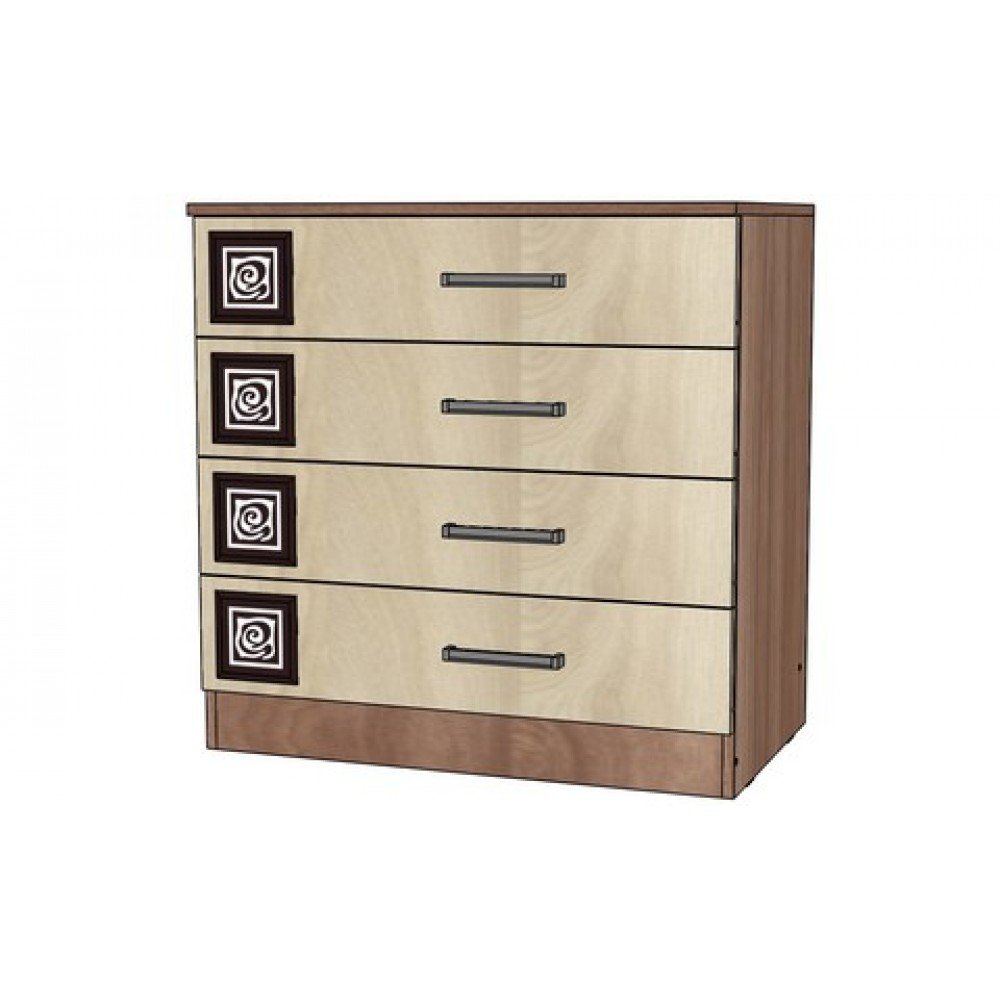 Материал ЛДСП. Кромка ПВХ, на ящиках применены роликовые направляющие. На фасадах ящиков применено декоративное стекло с рисунком, окрашенное по специальной технологии.