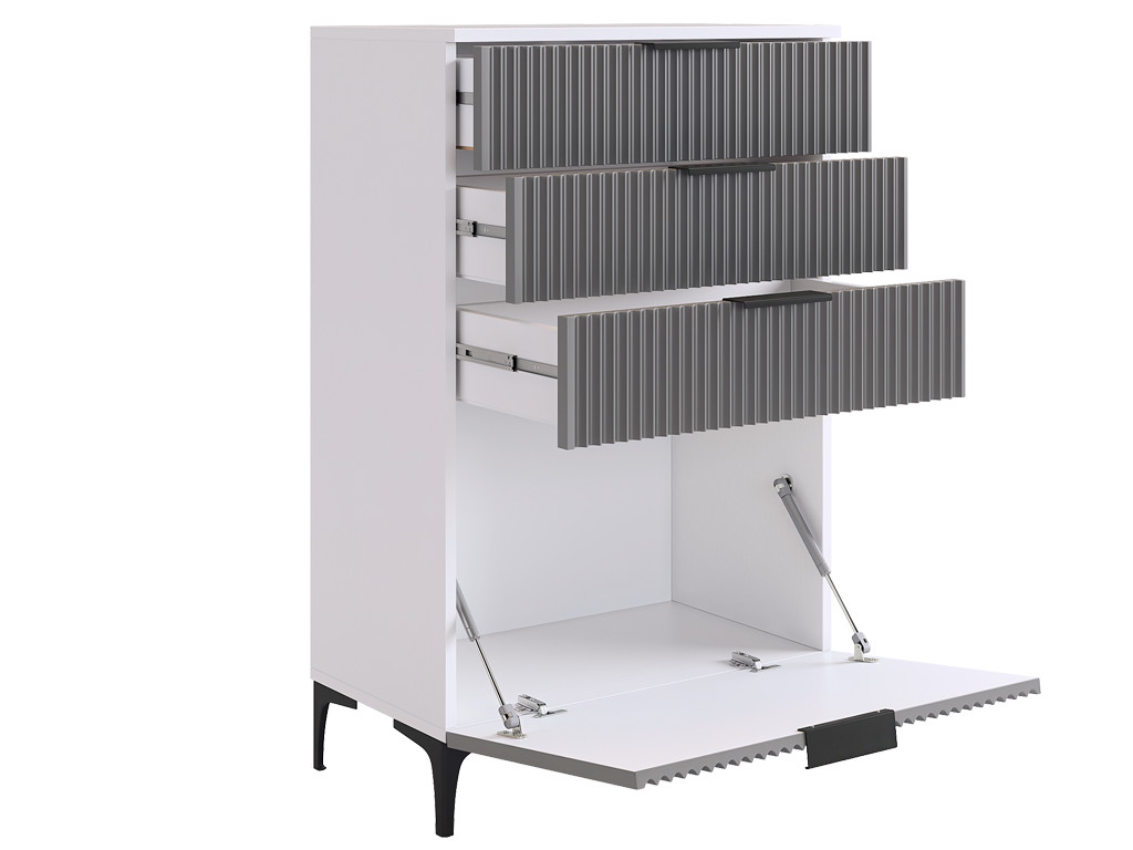 Комод «Зефир» — идеальное решение для детской и гостиной комнат. Он оснащён выкатными ящиками и откидной секцией, обеспечивая максимальный комфорт и удобство использования. Фасады украшены изящной фрезеровкой, которая придаёт изделию неповторимый шарм и элегантность.
