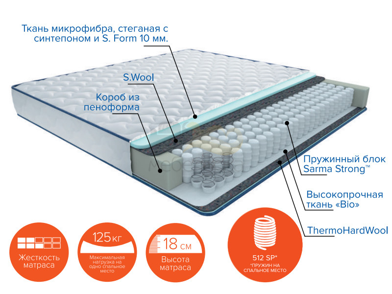 Наполнение: Независимый пружинный блок "Sarma Strong" (512 пружин на спальное место) + ThermoHardWool + ортопедическая пена S.Form 1 см + короб из пеноформа.