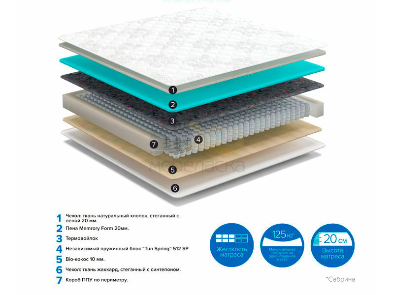 Наполнение : Блок независимых пружин + Пена Memory Form 20 мм+ усиление по периметру коробом ППУ