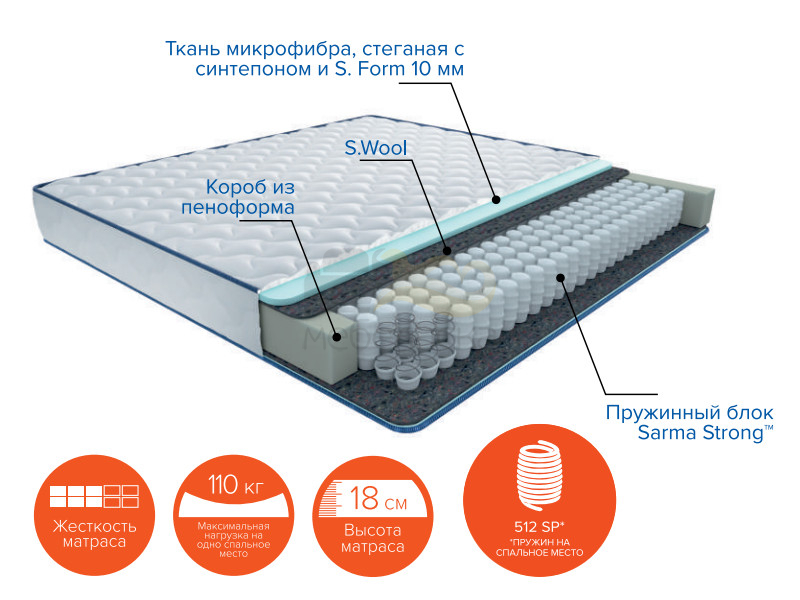Наполнение: Независимый пружинный блок "Sarma Strong" (512 пружин на спальное место) + ортопедическая пена S.Wool 2 см + короб из пеноформа.