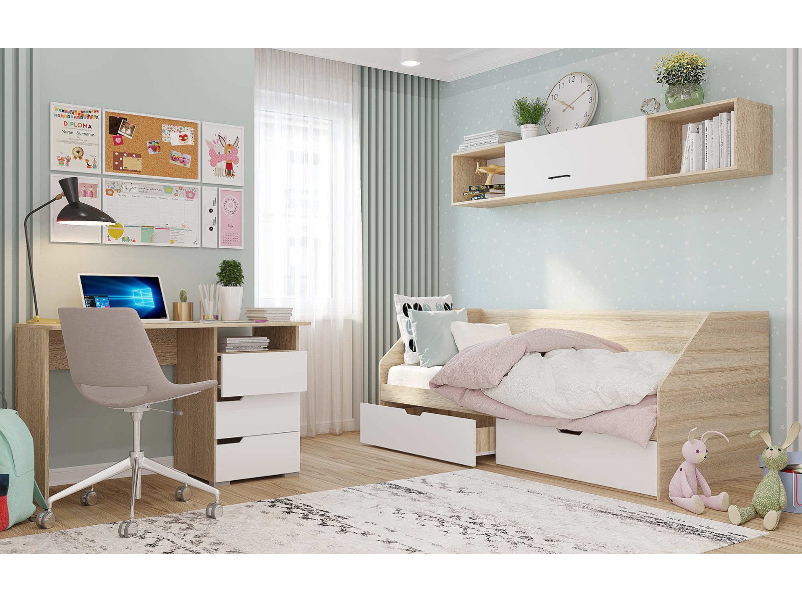 Цена за комплектацию на фото: Полка навесная 2032, Кровать , Стол 1200/3 ящ