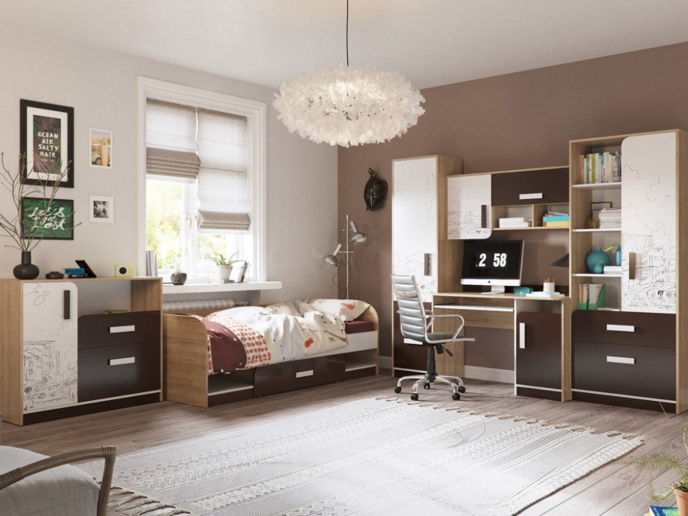 Детская модульная, комплектуется по вашему выбору. Цена указана за комплектацию на главном фото: 4-2007 Кровать, 4-44260 Комод, 6-0607 Стол, 6-9431 Шкаф стеллаж, 6-9432 Шкаф пенал, 6-9435 Шкаф настольный