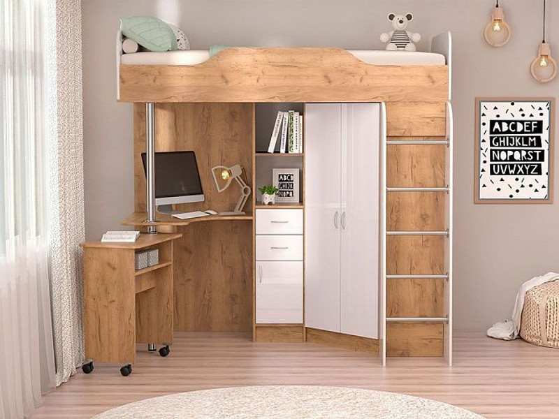В модульную спальню входит 3 предмета мебели: кровать-чердак, шкаф и стол с выкатным модулем. Допустимая нагрузка а спальное место - до 50 кг, допустимая высота матраса - не более 120 мм.