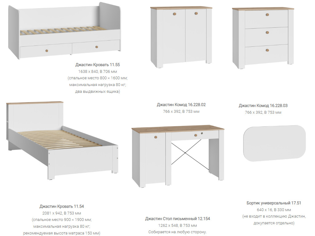 Цена за комплект: Кровать 11.55, Бортик универсальный 17.51, Комод 16.228.03, Шкаф для одежды 13.339