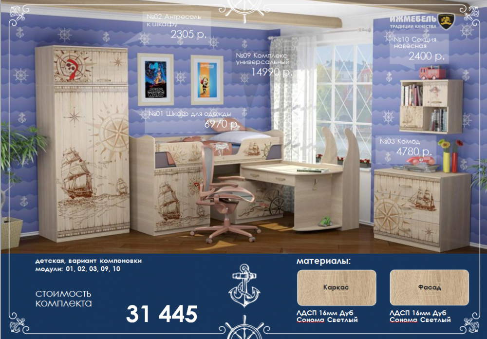 Цена указана за комплектацию на главном фото: Комплекс универсальный, Шкаф для одежды, Антресоль к шкафу, Комод, Секция навесная
