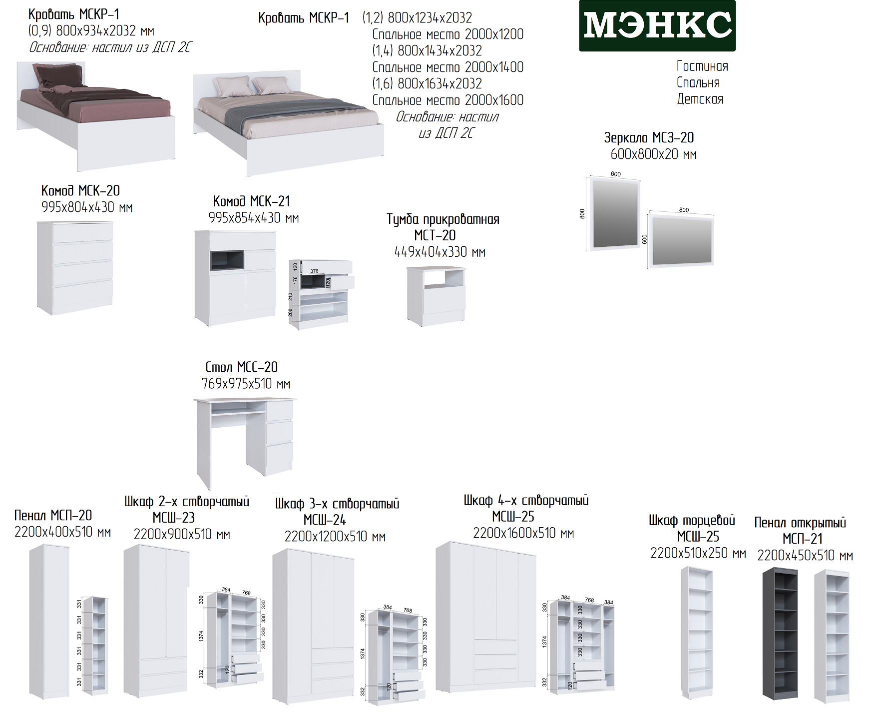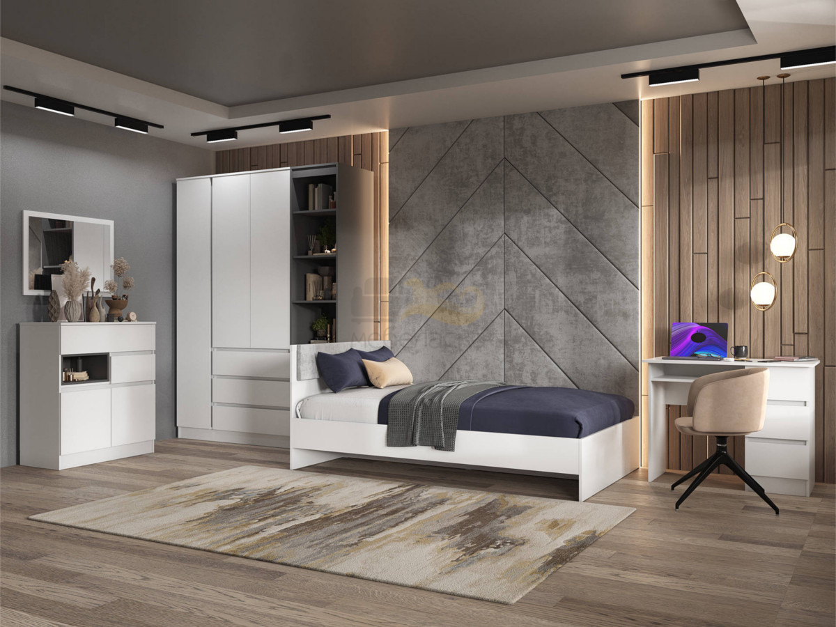 Цена за комплект: МСЗ-20 Зеркало, МСП-21 Пенал открытый графит, МСК-21 Комод, МСС-20 Стол туалетный, МСШ-24 Шкаф, МСКР-1 Кровать 0,9м с мягкой накладкой