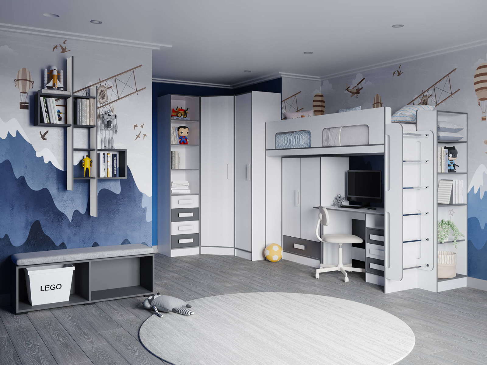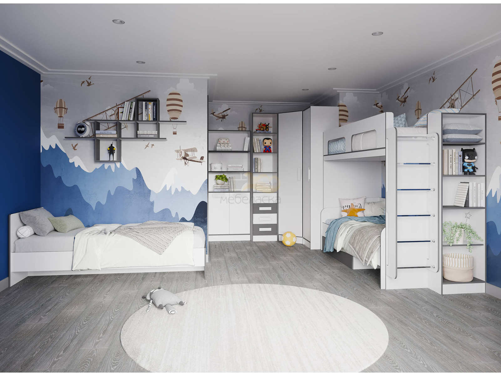 Цена за комплект: Пенал, Пенал с ящиками,Шкаф угловой, Стеллаж, Кровать-чердак, Кровать с ящиком, Кровать (сп/м 800*2000мм), Полка навесная
