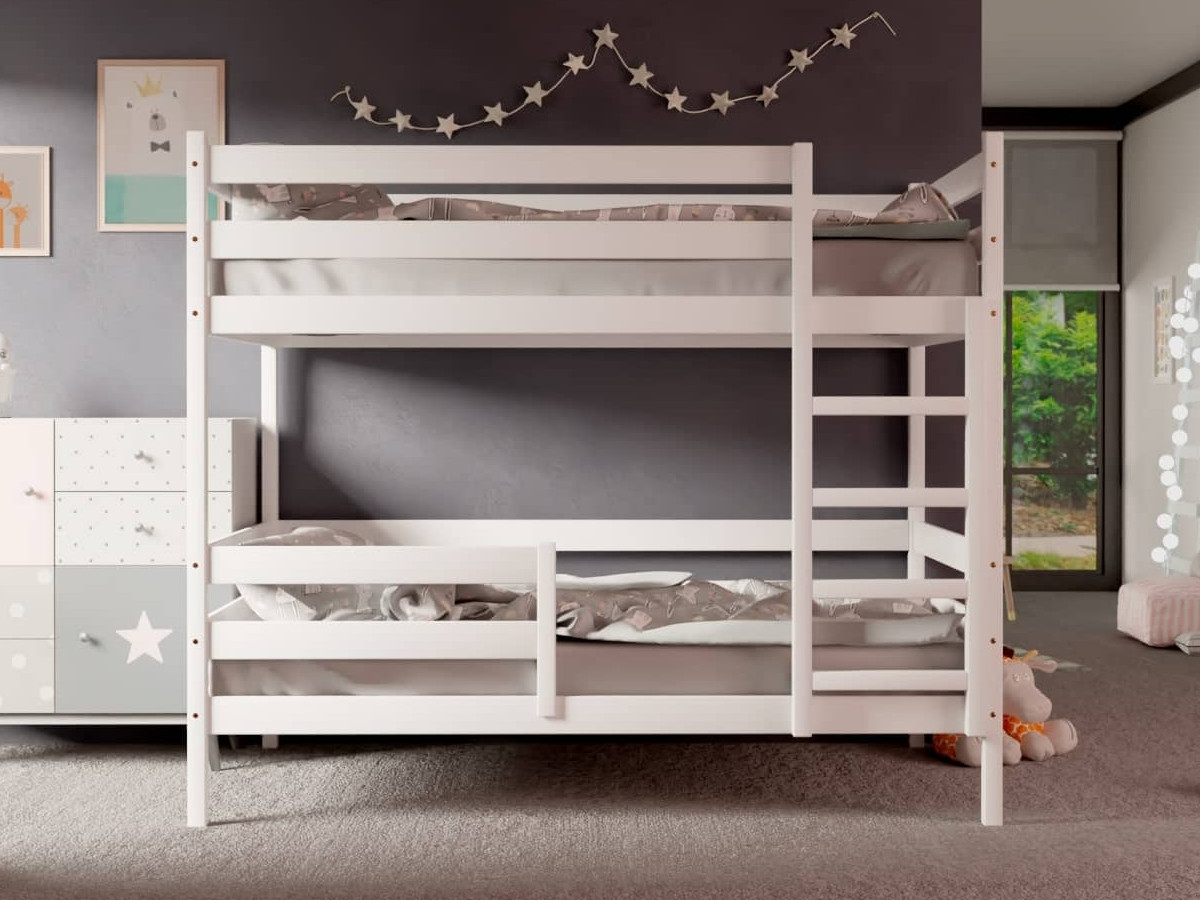 Передний бортик (съёмный, высота 39 см) на нижнем ярусе и лестница — универсальные, установка слева/справа.