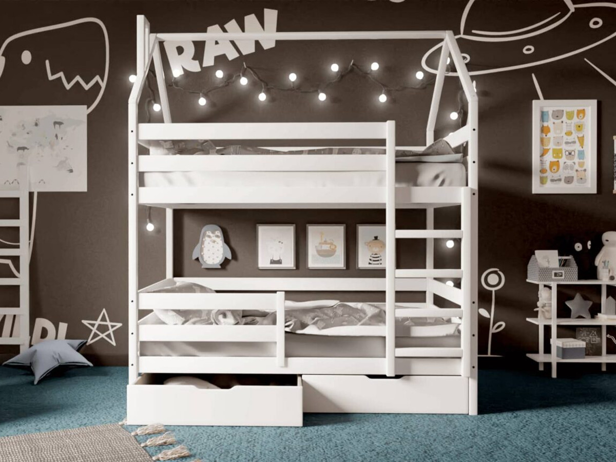 - Двухъярусная кровать-домик белый 80х160 см с ящиками