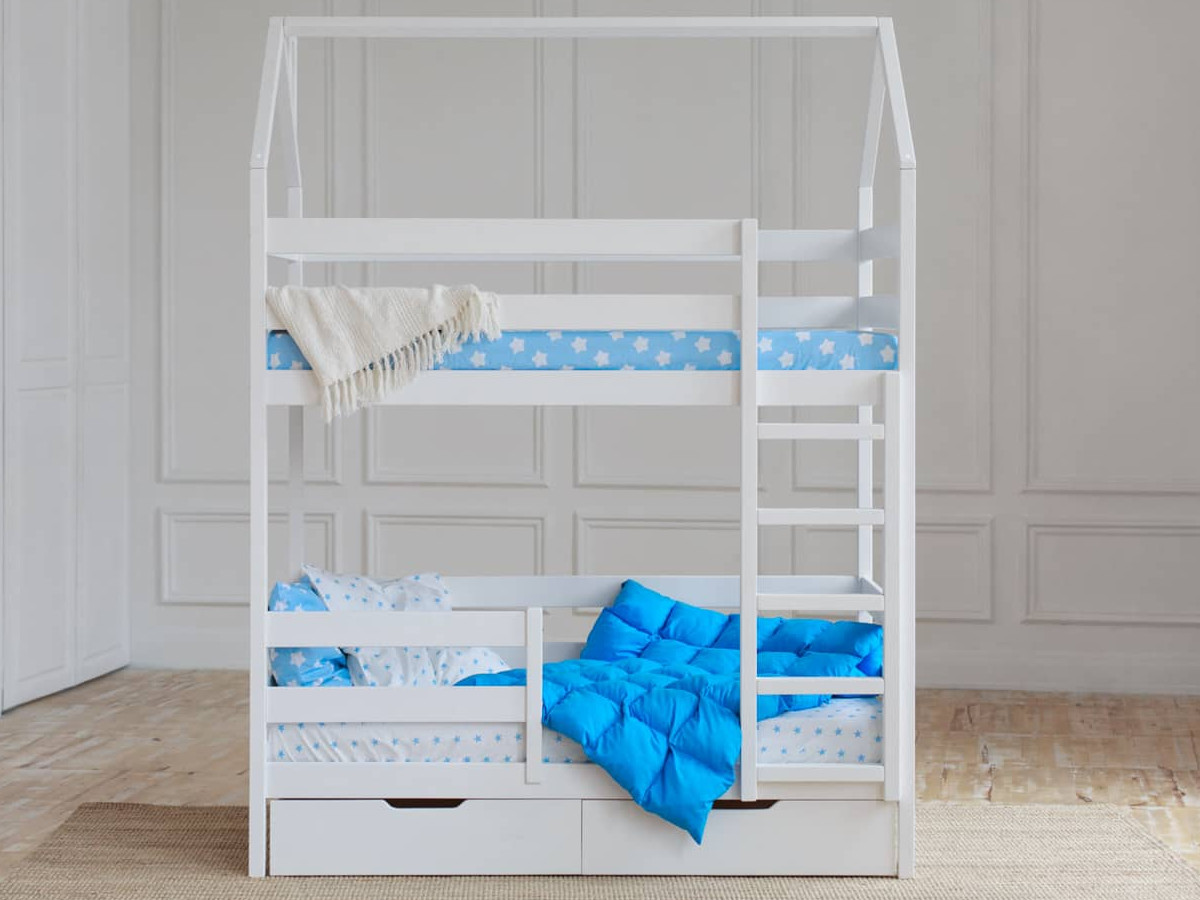 - Двухъярусная кровать-домик белый 80х190 см с ящиками