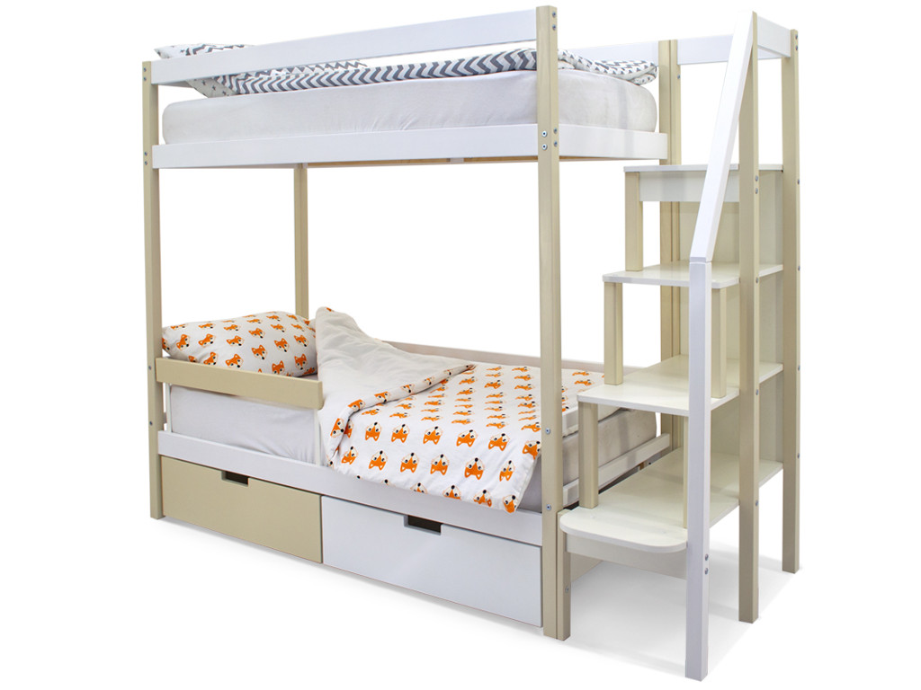 Двухъярусная кровать Svogen с ящиками и бортиком бежево-белый