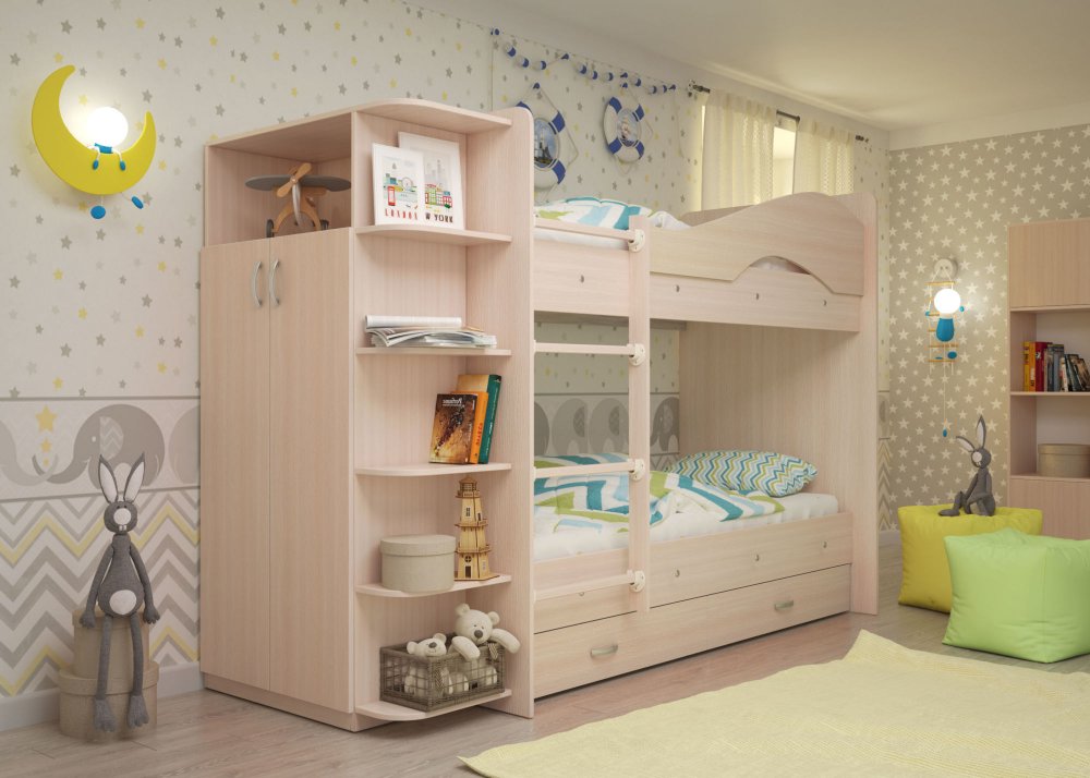 Двухъярусная кровать со шкафом Мая щиты дуб млечный
