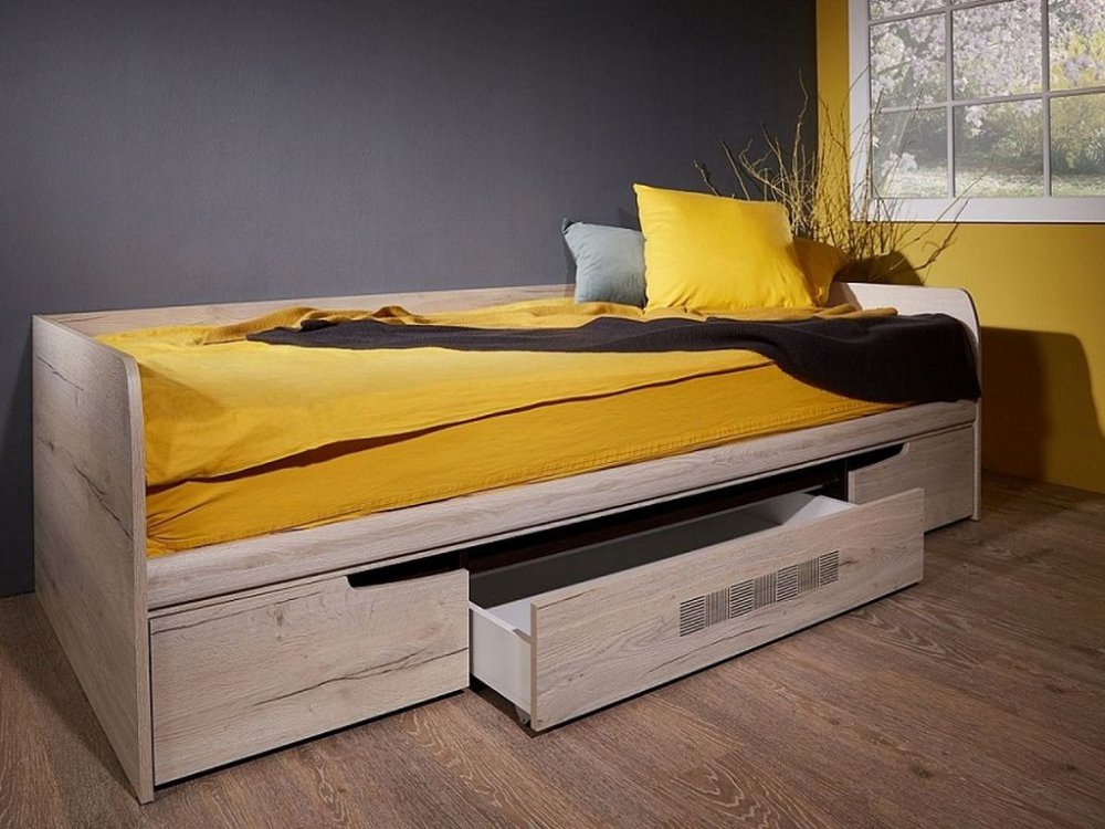 В кровати Мале расположены три бельевых ящика на выкатных роликах.