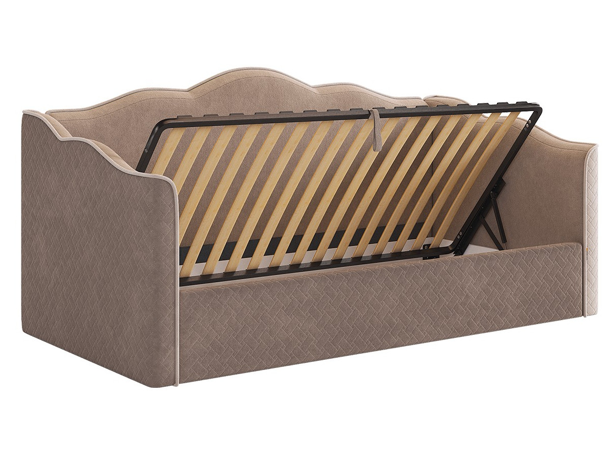 Кровать оснащена надежным подъемным механизмом, обеспечивающим доступ к вместительному ящику для хранения постельного белья и других вещей. Декоративные подушки с кисточками добавляют изысканности (входят в комплект), а специальный чехол для матраца обеспечивает дополнительную гигиеничность и удобство использования (комплектуется отдельно).