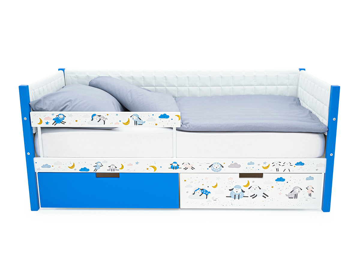 Кровать-тахта Svogen мягкая с ящиками и бортиком с фото синий/львята