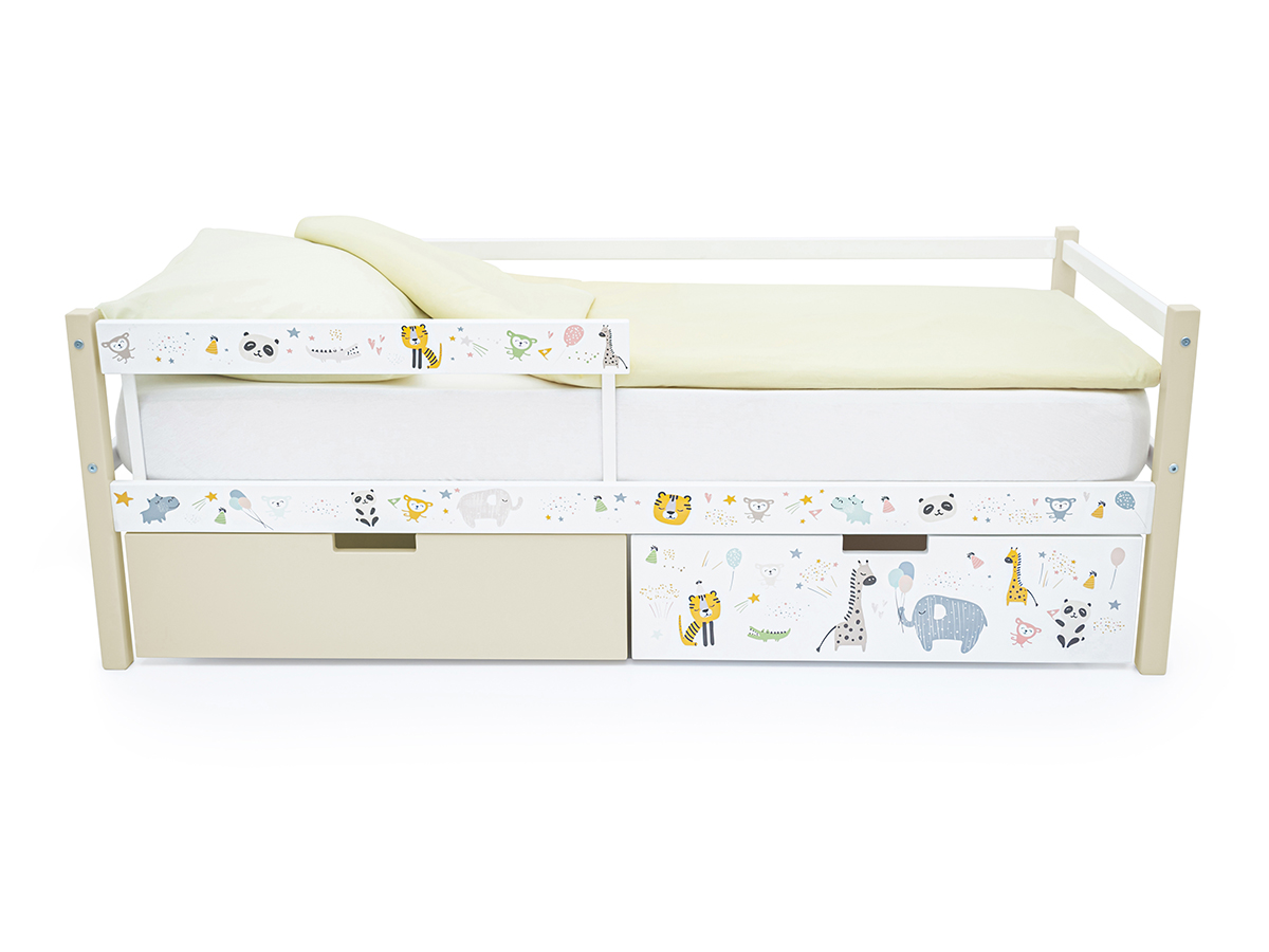Кровать-тахта Svogen с ящиками и бортиком с фотопечатью бежевый/зверята