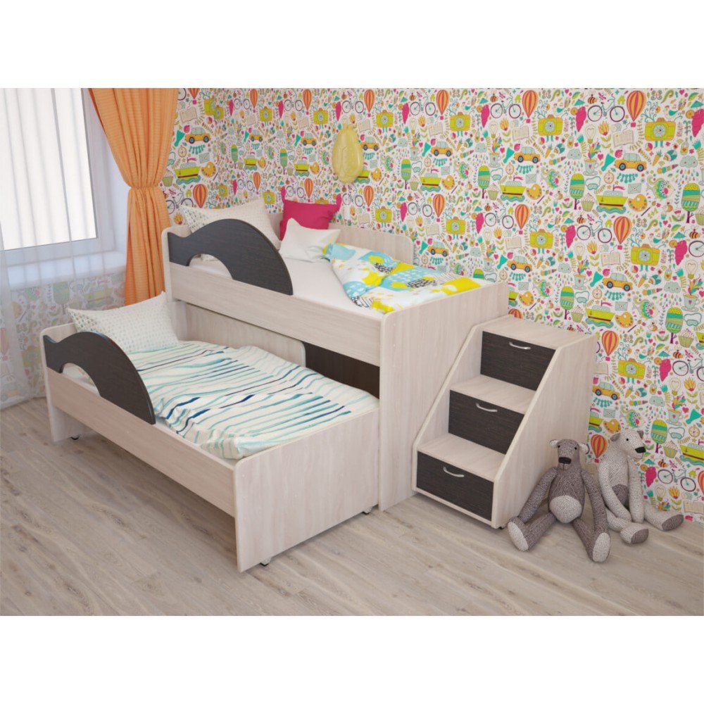 - Кровать 2-х ярусная выкатная с ящиком и лестницей Радуга венге