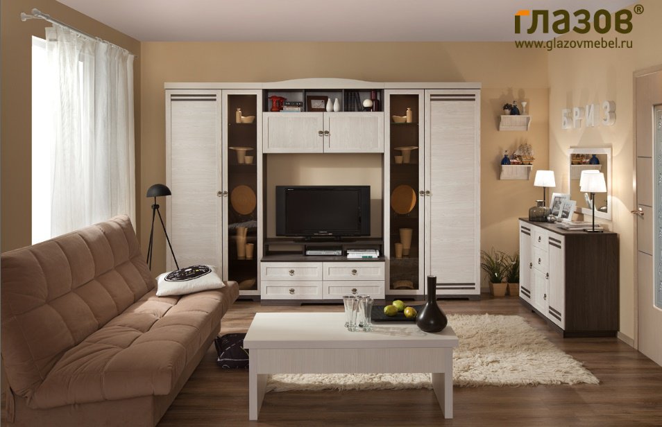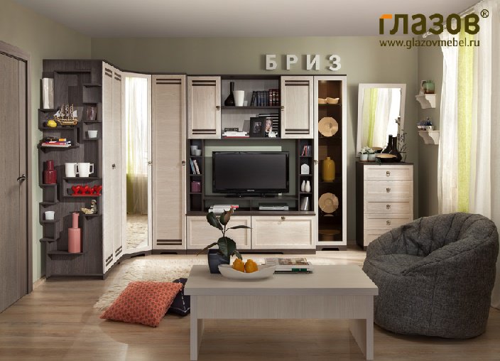 Гостиная БРИЗ — для ценителей стилей Прованс и Шебби-шик. Седой серо-коричневый оттенок корпуса Ясень Анкор темный создает в интерьере сентиментальный шарм «потертых» вещей. Его уравновешивает нежный сливочный оттенок фасадов — Бодега светлый.