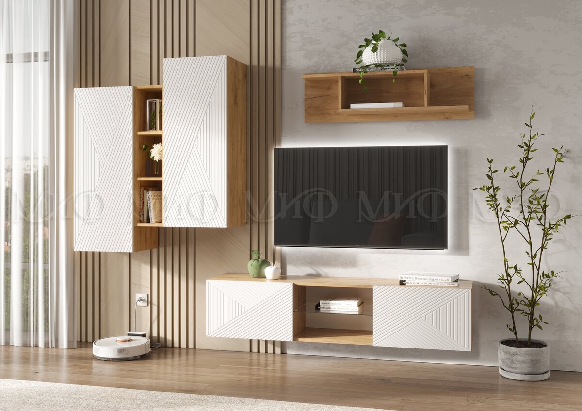 - Тумба ТВ подвесная 1500 Флэш Браш Вайт, Дуб Крафт