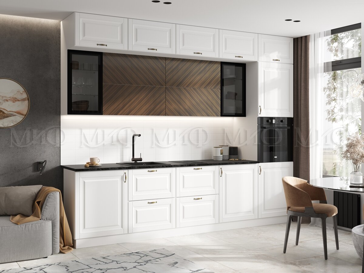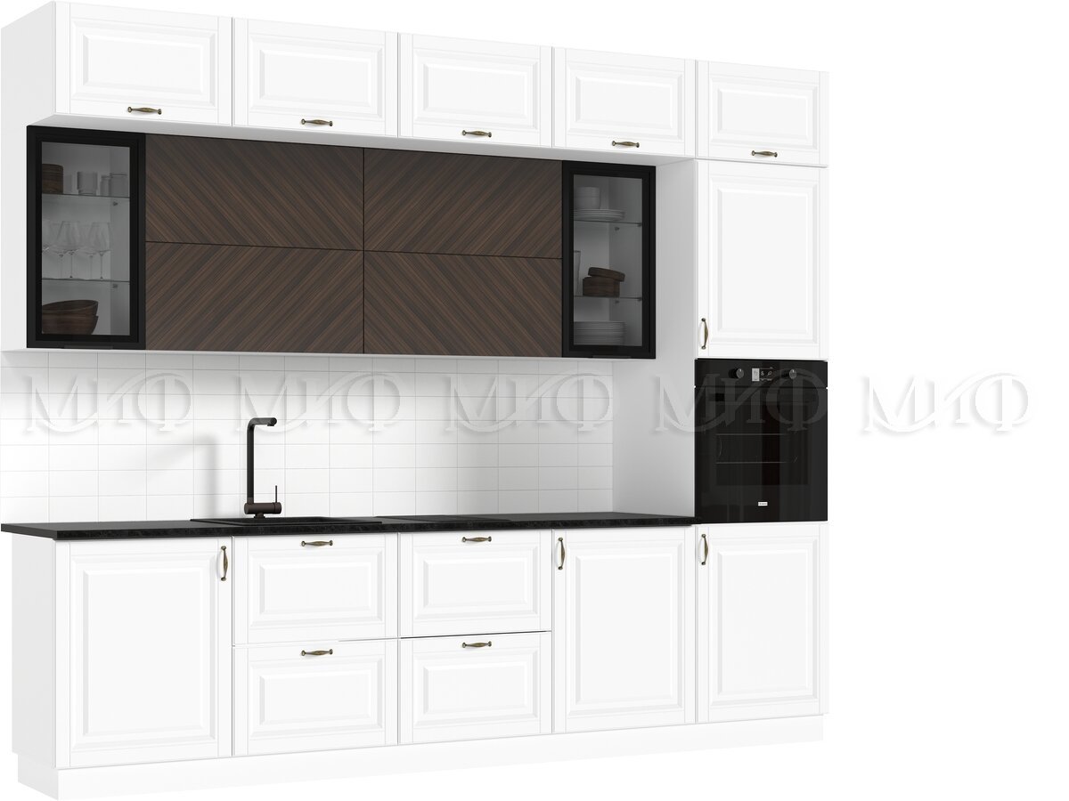 - Кухня Престиж 3000 мм Компоновка №2 Браш Вайт/Прайм орех