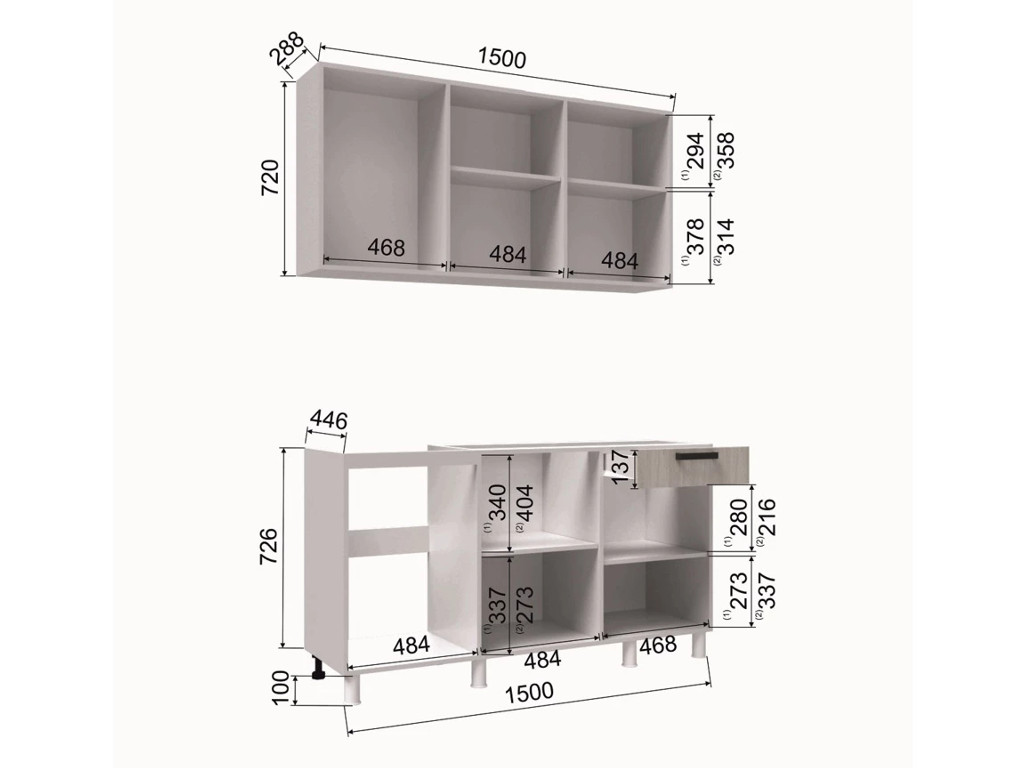 - Высота верхних шкафов, мм 720