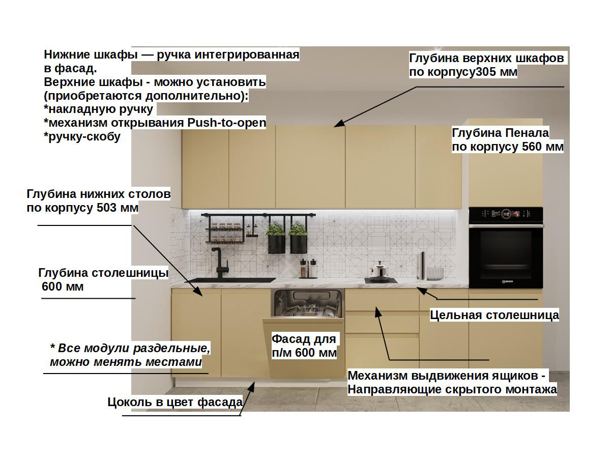 Кухонная мойка, стеновая панель, посудосушитель, планки для столешницы в комплект не входят.