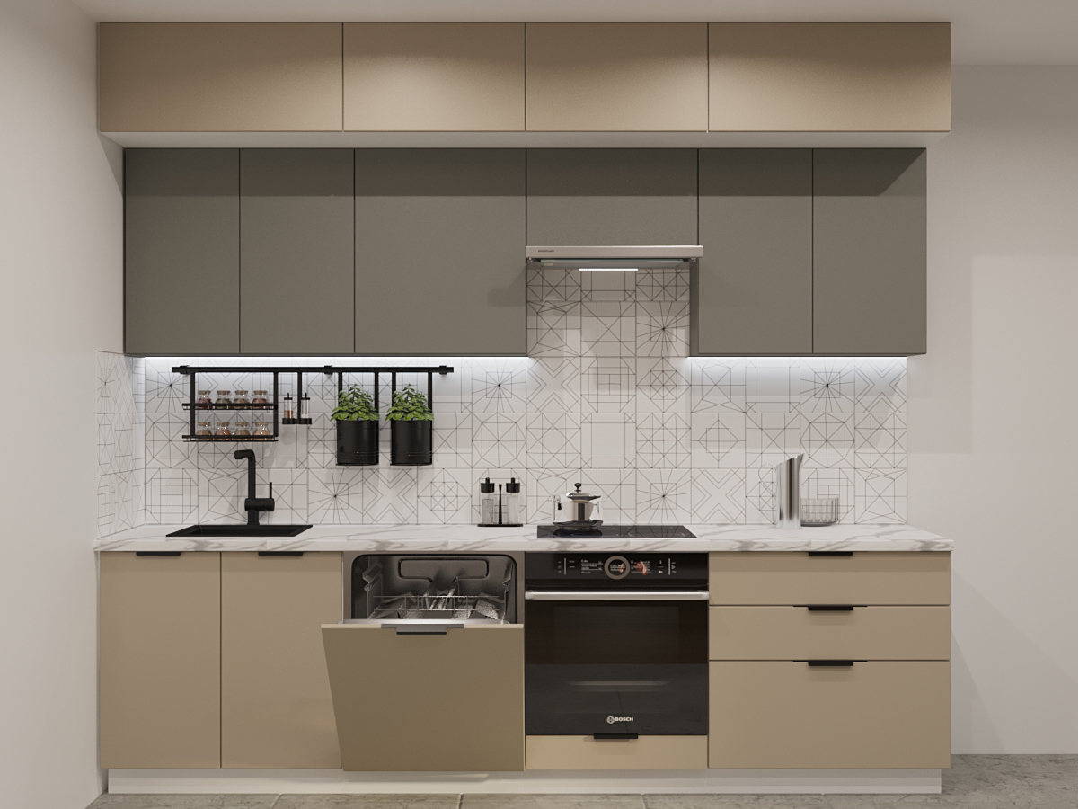Кухонная мойка, стеновая панель, посудосушитель, планки для столешницы в комплект не входят.