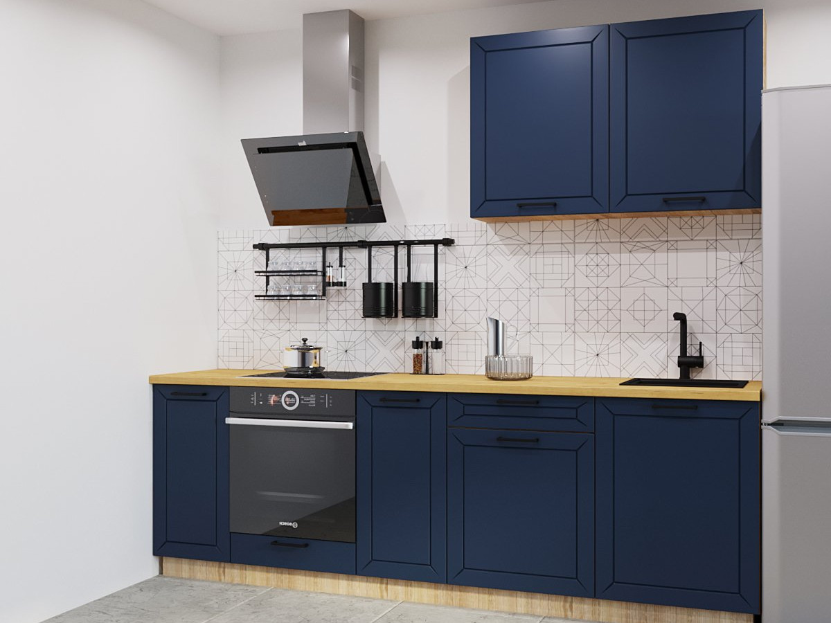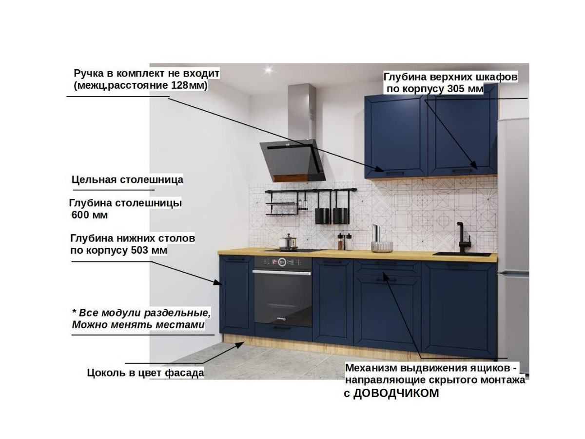 Кухонная мойка, стеновая панель, посудосушитель, планки для столешницы в комплект не входят.