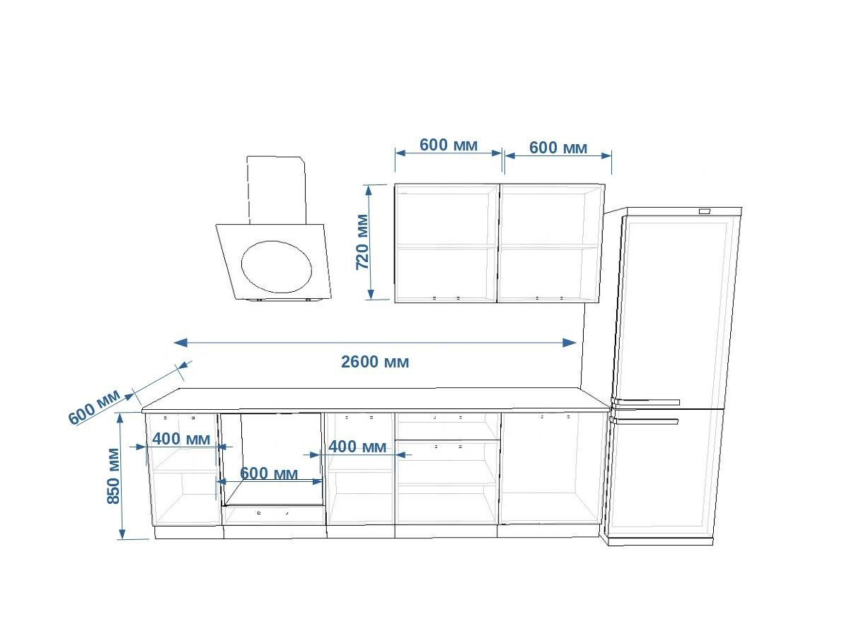 - высота верхних шкафов 720 мм
