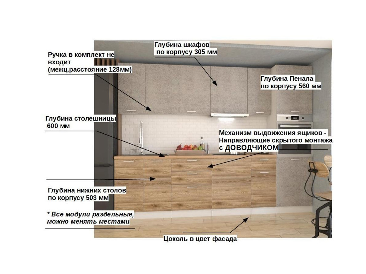 Кухонная мойка, стеновая панель, посудосушитель, планки для столешницы в комплект не входят.