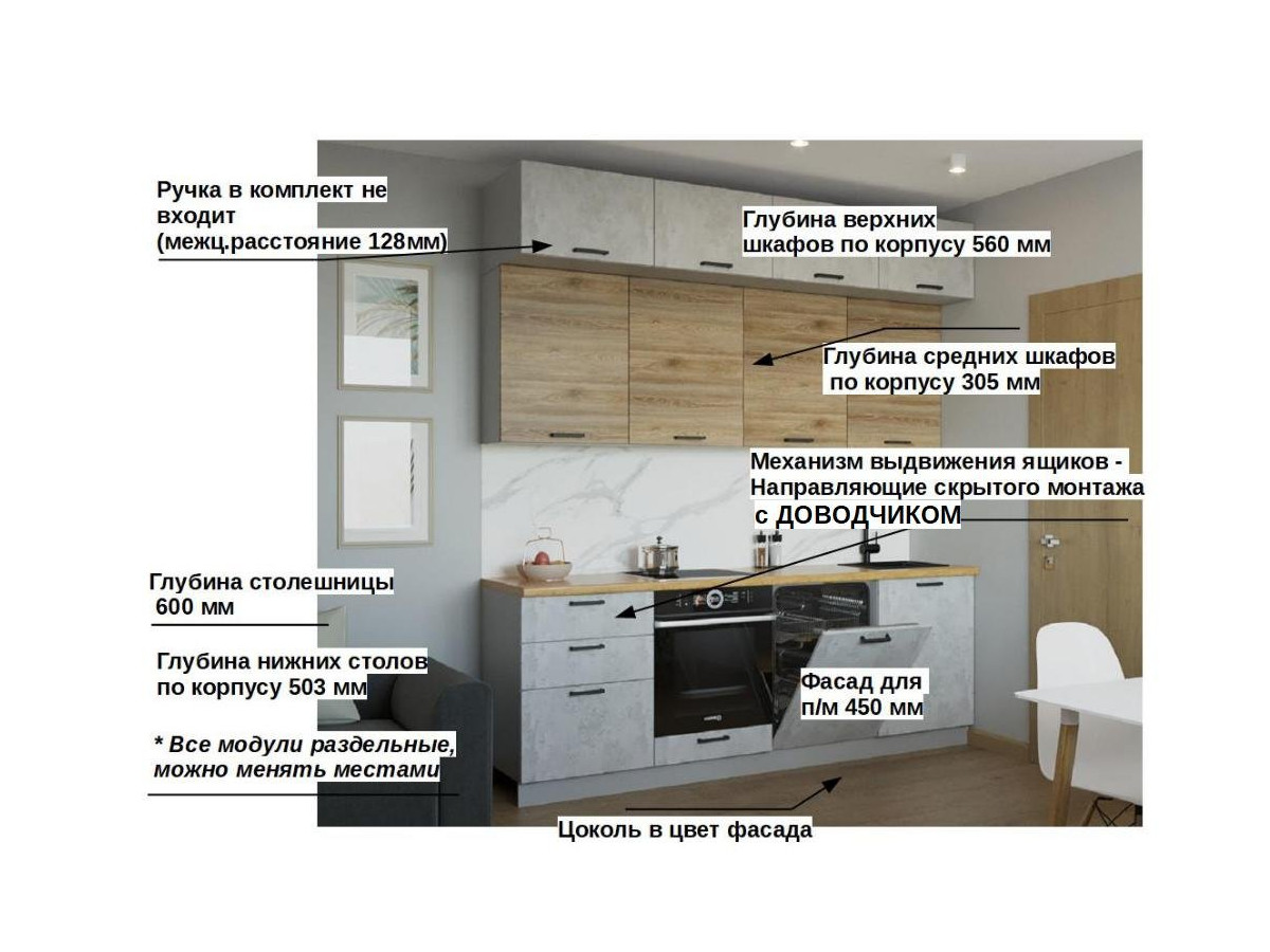 Кухонная мойка, стеновая панель, посудосушитель, планки для столешницы в комплект не входят.