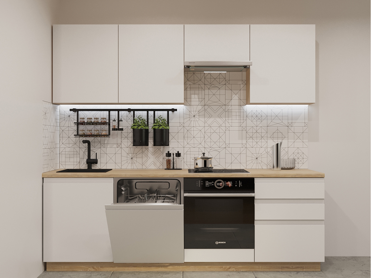 Кухонная мойка, стеновая панель, посудосушитель, планки для столешницы в комплект не входят.