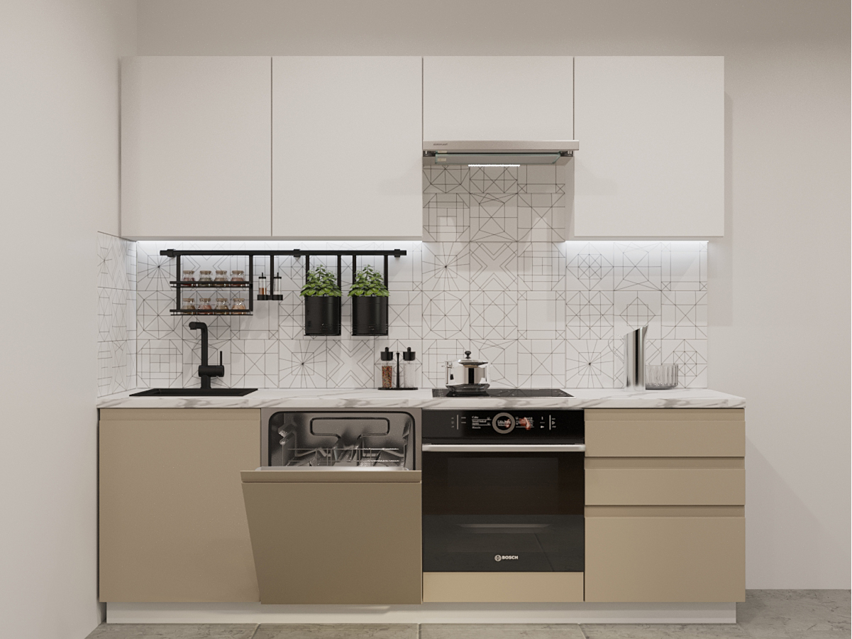 Кухонная мойка, стеновая панель, посудосушитель, планки для столешницы в комплект не входят.