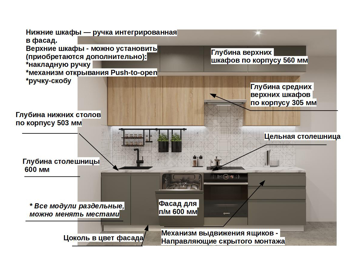 Кухонная мойка, стеновая панель, посудосушитель, планки для столешницы в комплект не входят.