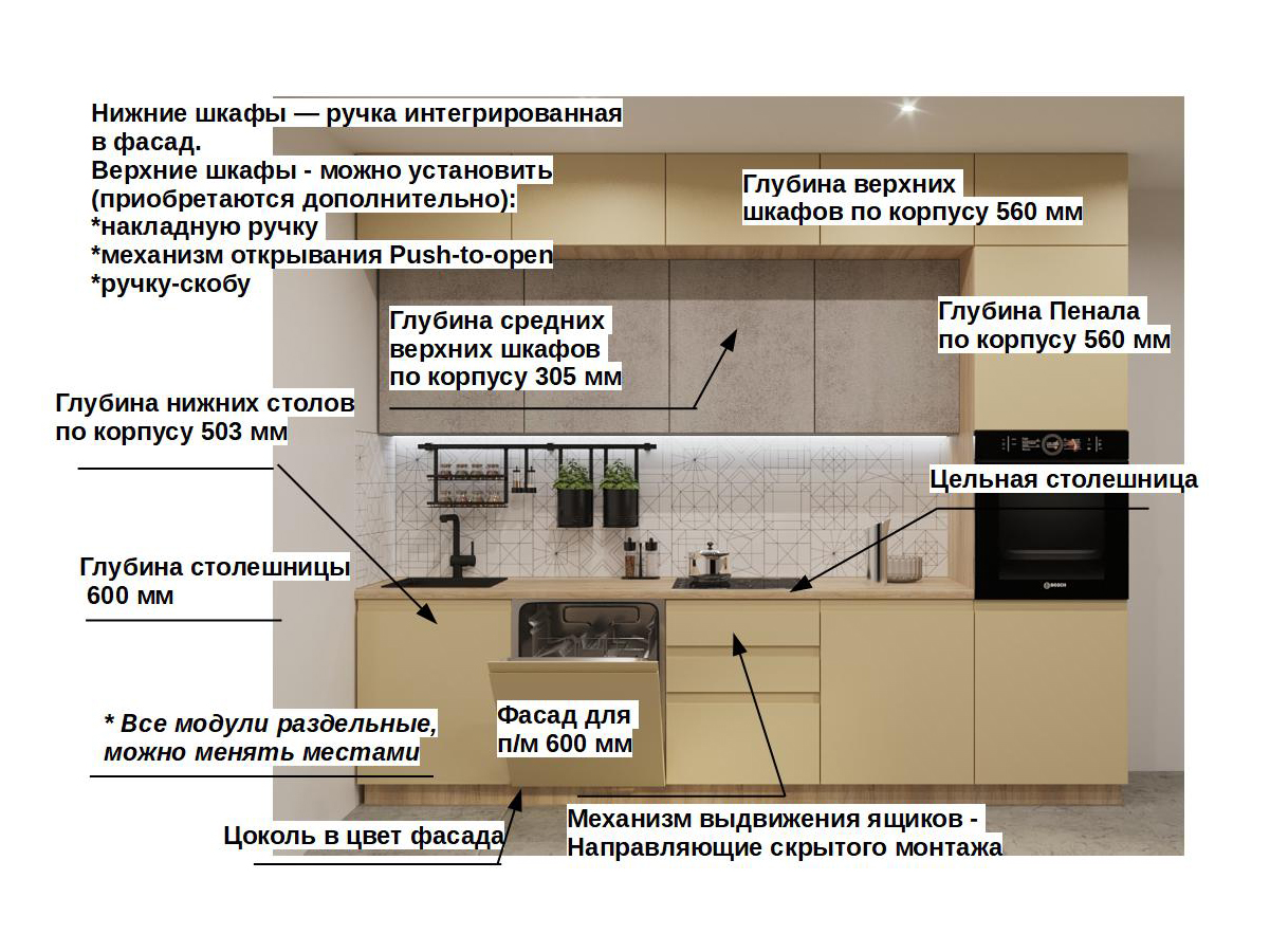 Кухонная мойка, стеновая панель, посудосушитель, планки для столешницы в комплект не входят.