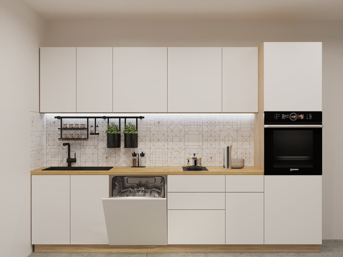 Кухонная мойка, стеновая панель, посудосушитель, планки для столешницы в комплект не входят.