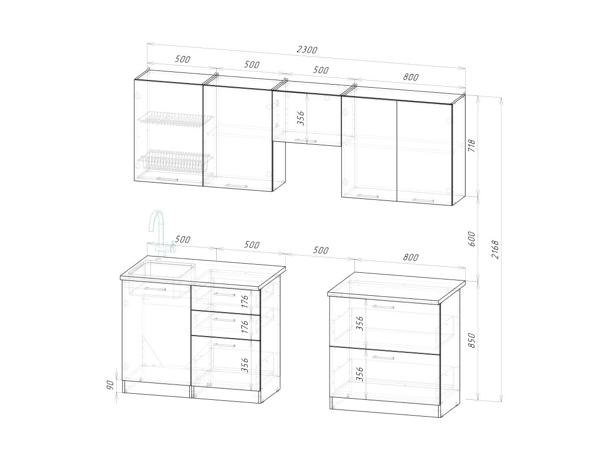 Мойка, смеситель, стеновая панель и посудосушитель в комплект гарнитура не входят.