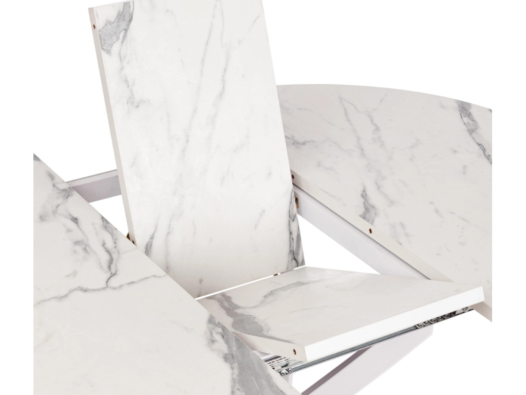 Столешница цвета Мрамор светлый и вставка «бабочка» выполнены из ЛДСП толщиной 22 мм на лицевую поверхность которых нанесен защитный слой HPL толщиной 1 мм. HPL имеет защитное покрытие оверлей высокой степени истирания, которое повышает устойчивость поверхностей к повреждениям. Механизм раздвижения синхронный со вставкой "бабочка". Кромка столешницы оклеена высокопрочной пленкой из ПВХ толщиной 2 мм. Каркас стола выполнен из ЛДСП толщиной 16 мм. Стильные изогнутые металлические ножки окрашены порошковой краской. Устойчивые ножки стола регулируются по высоте для устранения неровности пола. За столом могут разместиться от 2 до 6 человек. Стол прост в сборке, инструкция по сборке прилагается.