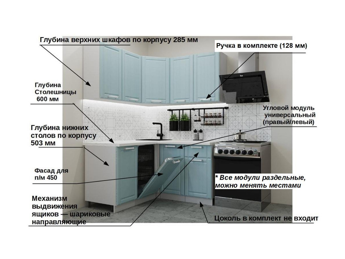 Кухонная мойка, стеновая панель, посудосушитель, планки для столешницы в комплект не входят.