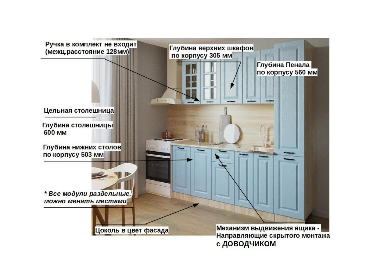 Кухонная мойка, стеновая панель, посудосушитель, планки для столешницы в комплект не входят.