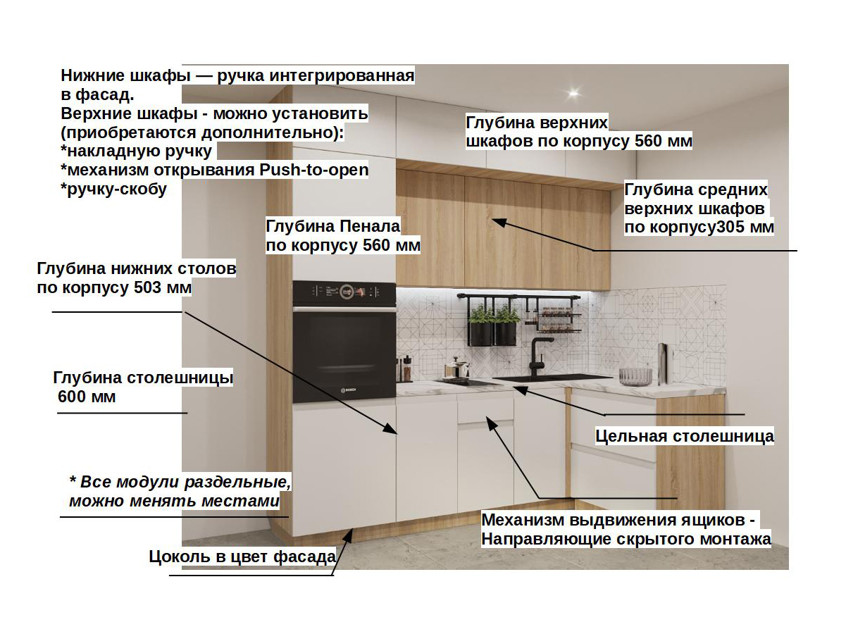 Кухонная мойка, стеновая панель, посудосушитель, планки для столешницы в комплект не входят.