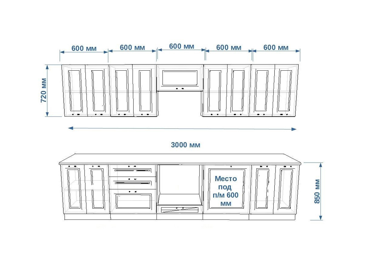 - высота верхних шкафов 720 мм