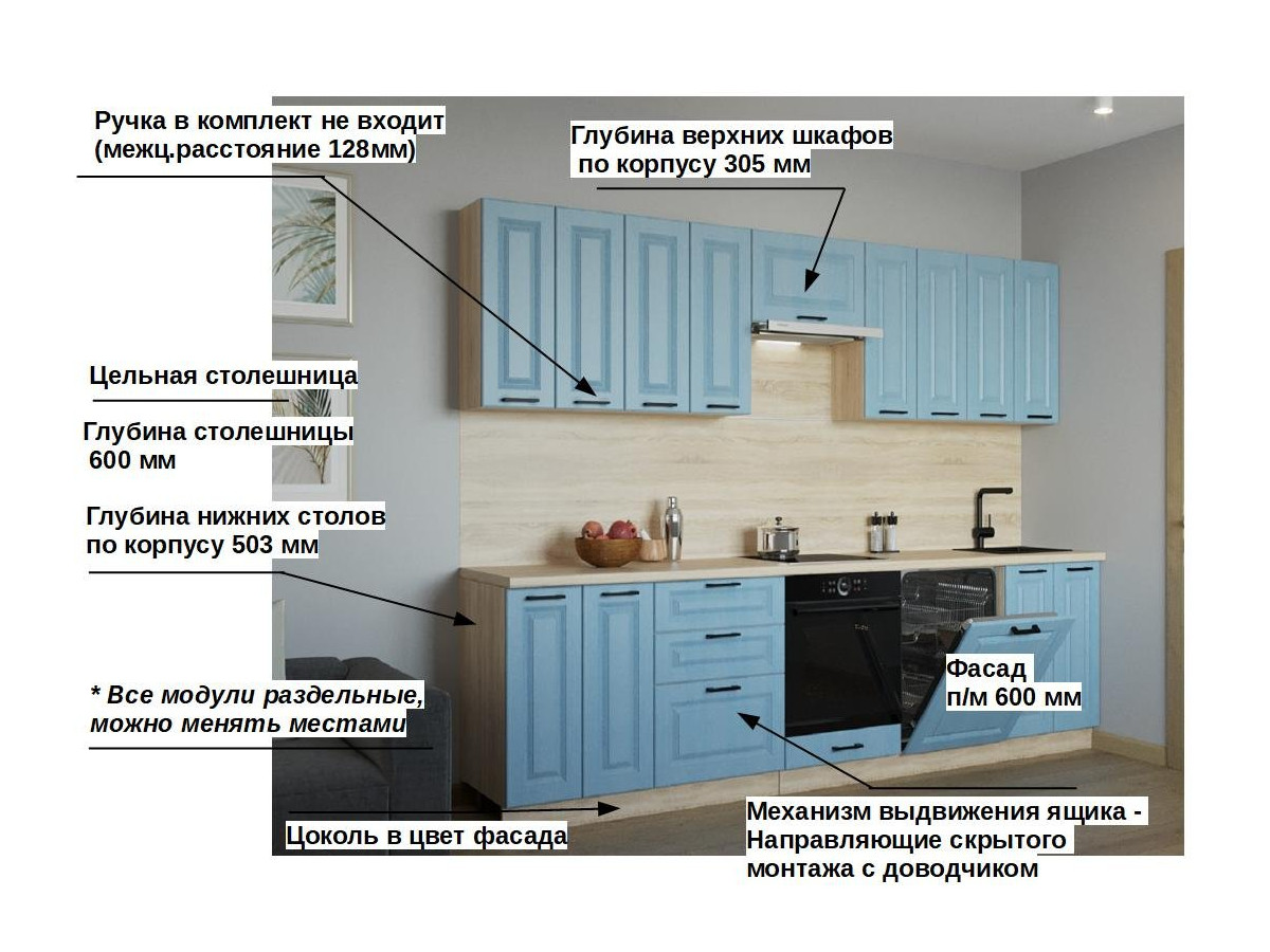 Кухонная мойка, стеновая панель, посудосушитель, планки для столешницы в комплект не входят.