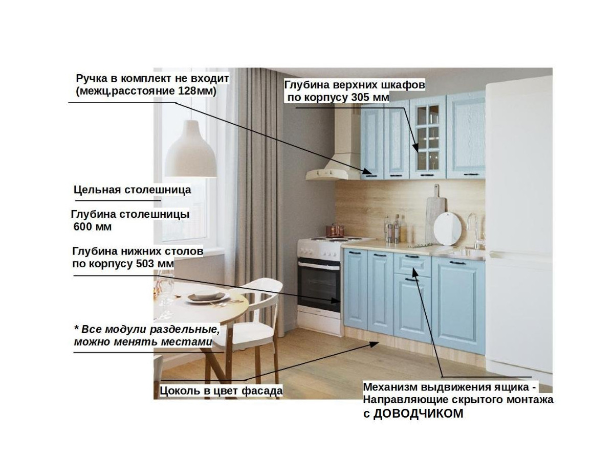 Кухонная мойка, стеновая панель, посудосушитель, планки для столешницы в комплект не входят.