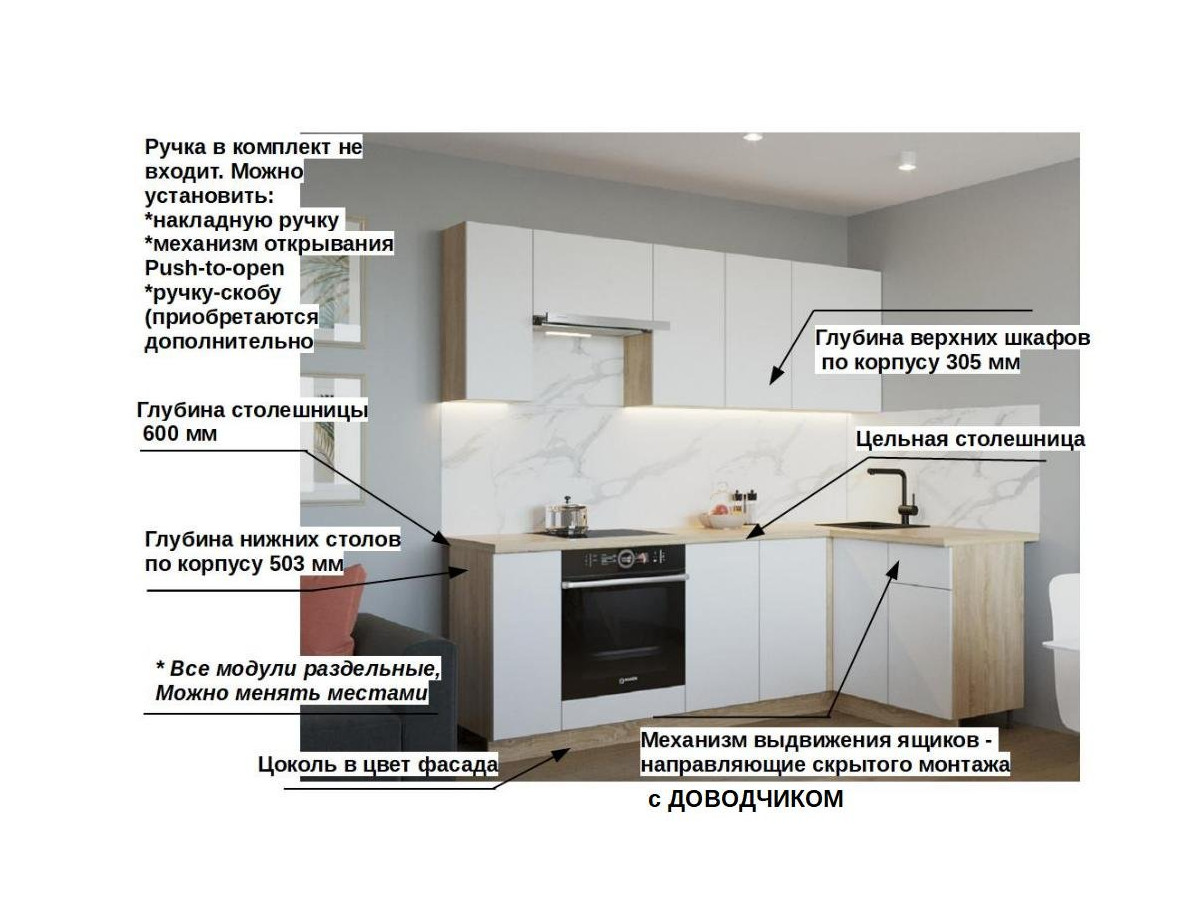 Кухонная мойка, стеновая панель, посудосушитель, планки для столешницы в комплект не входят.