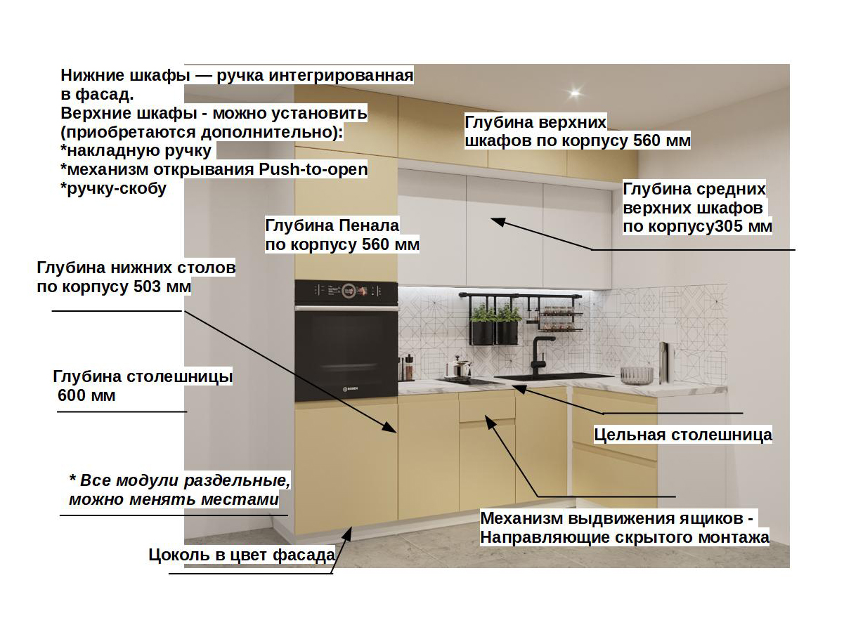Кухонная мойка, стеновая панель, посудосушитель, планки для столешницы в комплект не входят.